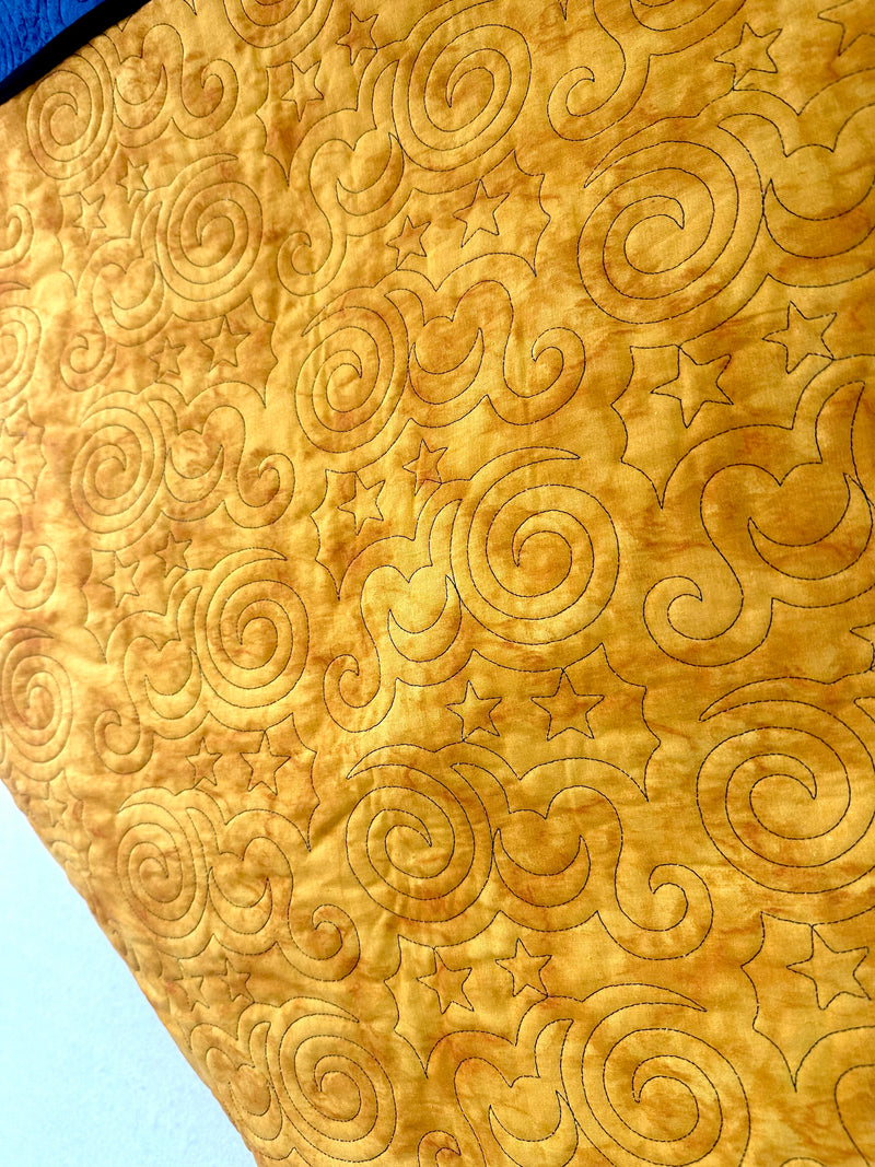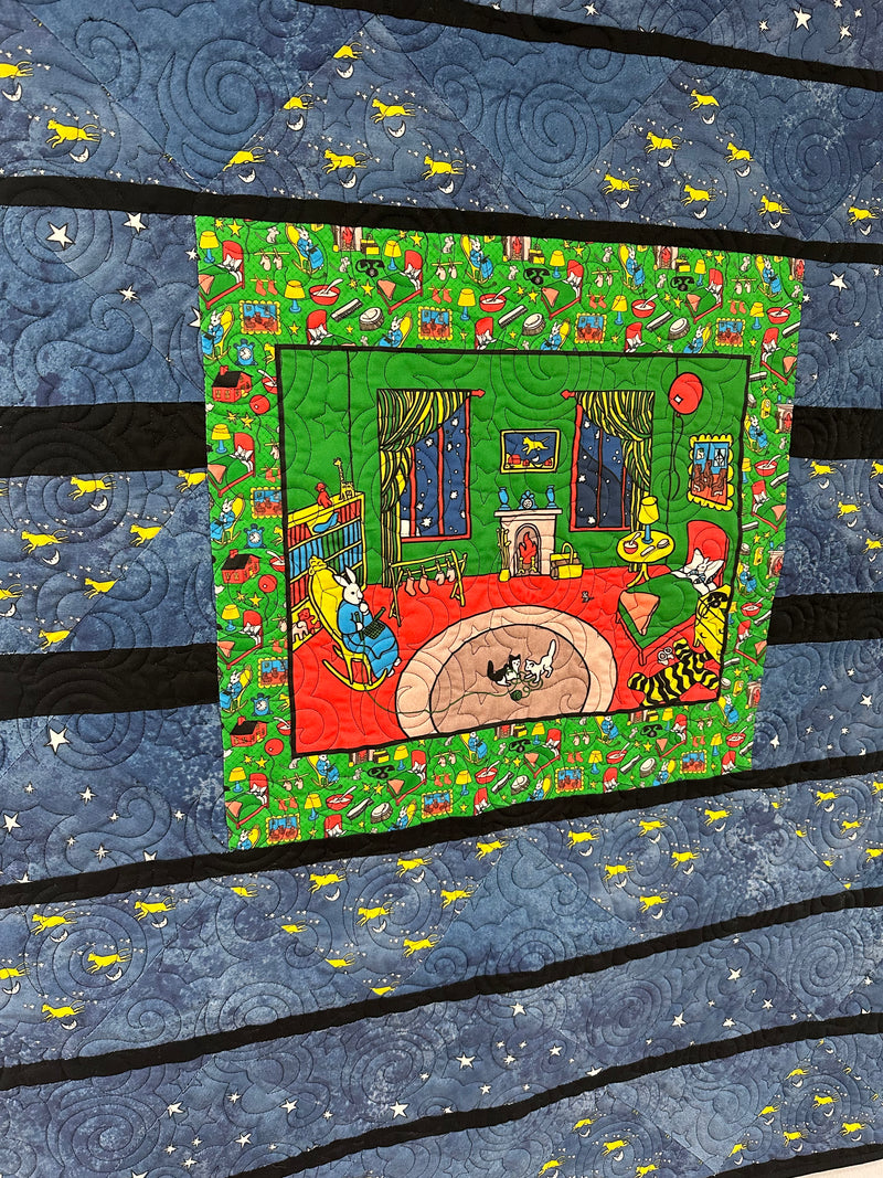 This is a handmade crib quilt measuring 35x47, using custom designed fabrics to showcase the cow jumping over the moon and twinkling stars this crib quilt has a cotton backing and batting on the inside.